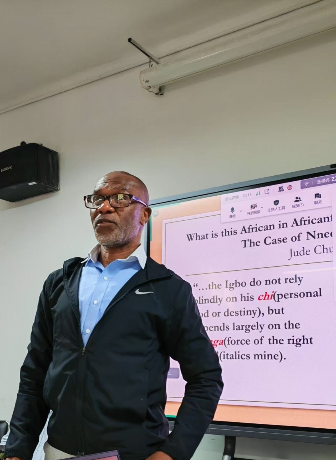 2025年9月26日,北京外国语大学非洲学院成功举办北外非洲讲堂第二十四讲——健忘的记忆:“非洲未来主义”中的“非洲”何在?主讲人为美国德克萨斯州圣安东尼奥德克萨斯大学教授裘德·楚迪·奥克帕拉(Jude Chudi Okpala),讲座由非洲学院教师李春光主持,北京大学外国语学院程莹副教授担任与谈人,来自北外非洲学院、法语学院、西葡学院、国际新闻与传播学院等校内外50余名师生参加了此次讲座。